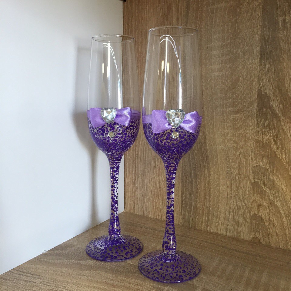 Свадебные бокалы с росписью, атласной ленточкой, бантиком и стразом, под заказ в любом цвете до 5 рабочих дней