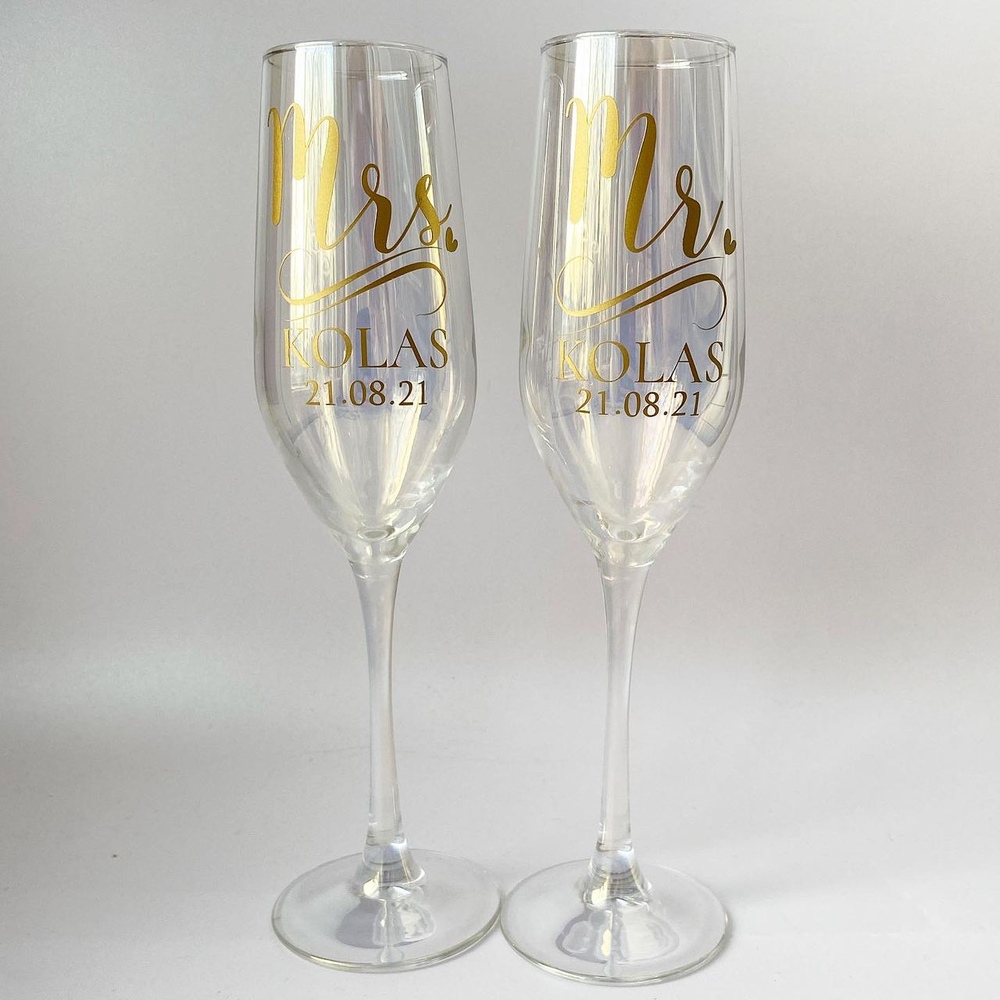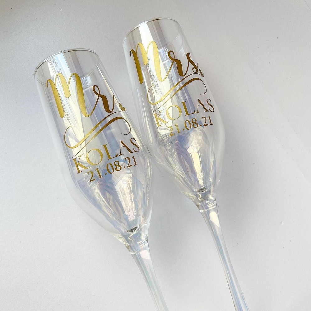 Бокалы в форме тюльпана, символизирующие жениха и невесту. Декорированы надписями Mr и Mrs и фамилия. Можно сделать любую надпись под заказ до 5 рабочих дней